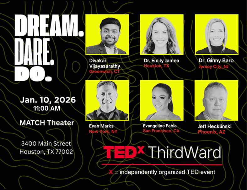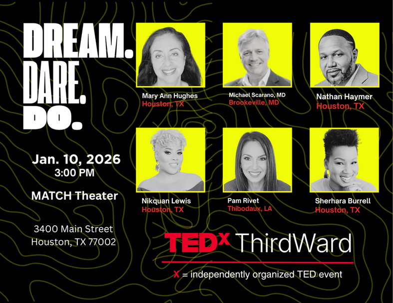 TEDxThirdWard is an independently organized TEDx event happening in Houston’s Third Ward. With the theme "Dream. Dare. Do.," the event showcases talks and performances that inspire curiosity, spark action, and foster collaboration.