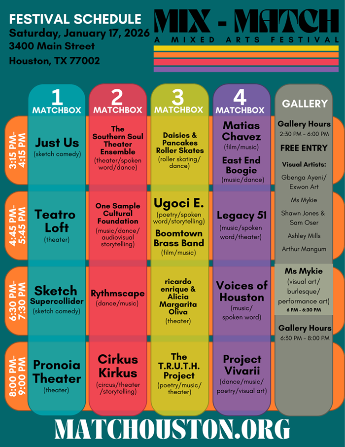 Midtown Arts & Theater Center Houston (MATCH) is thrilled to announce the 3rd Annual Mix-MATCH: A Mixed Arts Festival, a one-day celebration of Houston’s vibrant creative community. The event will take place on Saturday, Jan. 17, 2026, at MATCH, from 3 to 10 p.m. The festival will feature an extraordinary lineup of local performances, installations and exhibits that showcase the depth and diversity of the city’s cultural landscape.